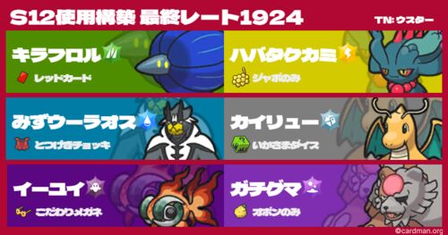 みなさんこんにちは!ウスターです! ポケモンSVシーズン12お疲れさまでした!! 今季は早い段階でレートを上げられていたので 噛み合えばレート2000目指せるかもって思ってましたが 現実は甘くなかったです...w 個人的には少し悔いの残る結果でしたが 最終3…