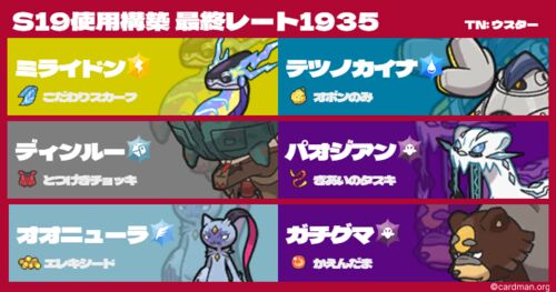 みなさんこんにちは!ウスターです! ポケモンSVシーズン19お疲れさまでした!! シーズン後半は個人的な用事でめちゃくちゃ忙しかったですが なんとか最終3桁順位に入ることができたのでメモ書き程度に記事を残しておきます! 時間が無かった関係上、構築自…